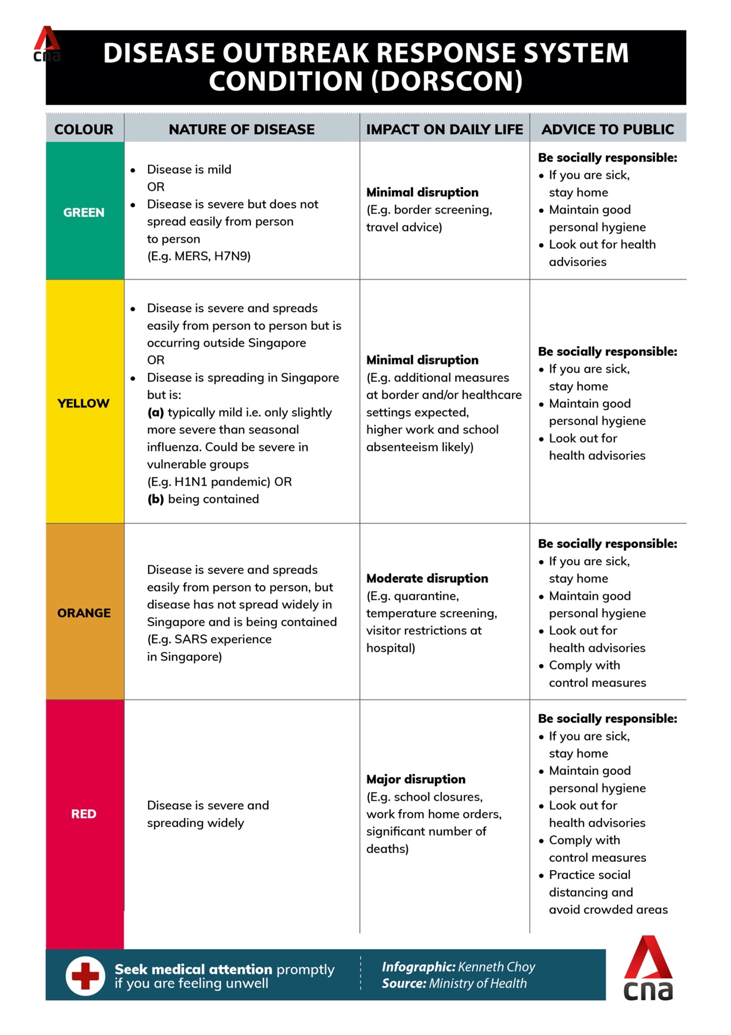 On 7th Feb 2020, the Ministry of Health (MOH) announced that Singapore’s risk assessment of ‘Disease Outbreak Response System Condition’ (DORSCON) alert levels has moved up from yellow to orange. (Ministry of Health [MOH], 2020)