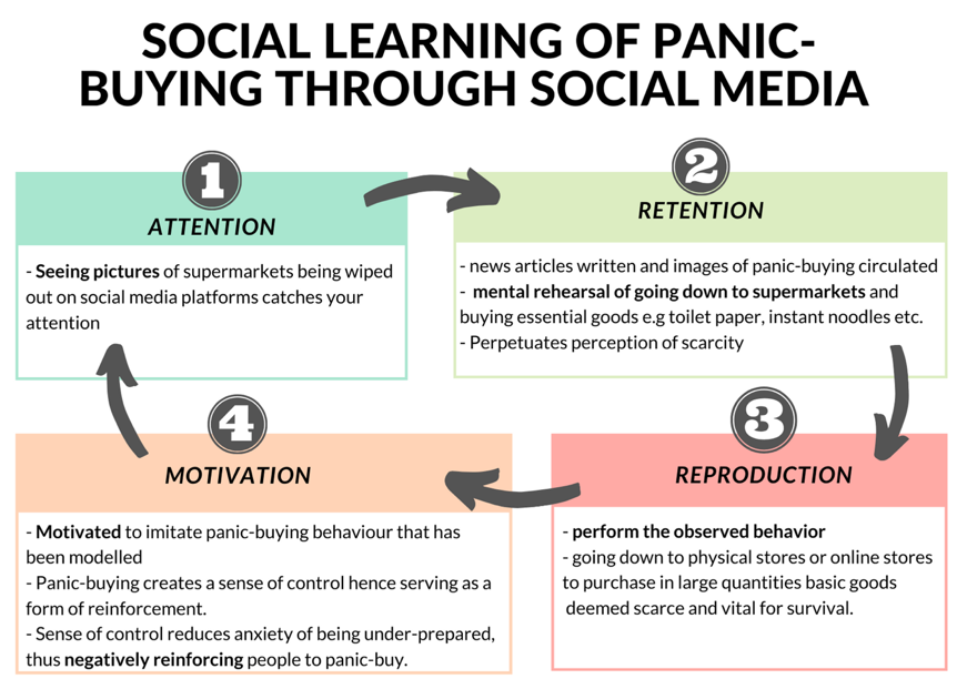 Through social media, social learning of panic-buying takes place. Social learning refers to the view that people learn by observing others. This can be seen in the figure below that explains how social media contributed to social learning of panic buying, according to Albert Bandura’s social learning theory (1977).